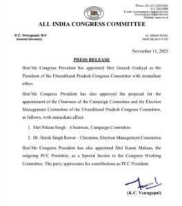 गणेश गोदियाल को फिर उत्तराखंड कांग्रेस की कमान: हरक और प्रीतम को बड़ी जिम्मेदारी, जिला अध्यक्षों की भी घोषणा
